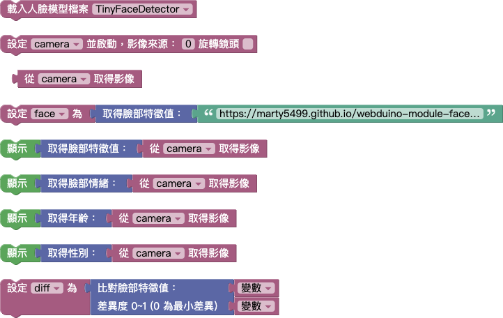 只要拼幾塊積木,載入人臉模型,啟動影像來源 ( WebCam 或 WebEye ) 即可取得人臉特徵值,並可以偵測出七種情緒 angry ( 生氣 )、disgust ( 厭惡 )、fear ( 害怕 )、happy ( 快樂 )、sad ( 傷心 )、surprise ( 驚訝 )、neutral ( 中性 )。