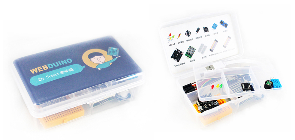 Dr. Smart 開發者套件內含 Webduino Smart 開發板與多個電子元件、傳感器,是 Webduino 系列產品中最精簡的一個組合。搭配官方網站一系列對應的教學案例,你將可以在最短的時間內,快速地學習到 Webduino 的基礎精髓!