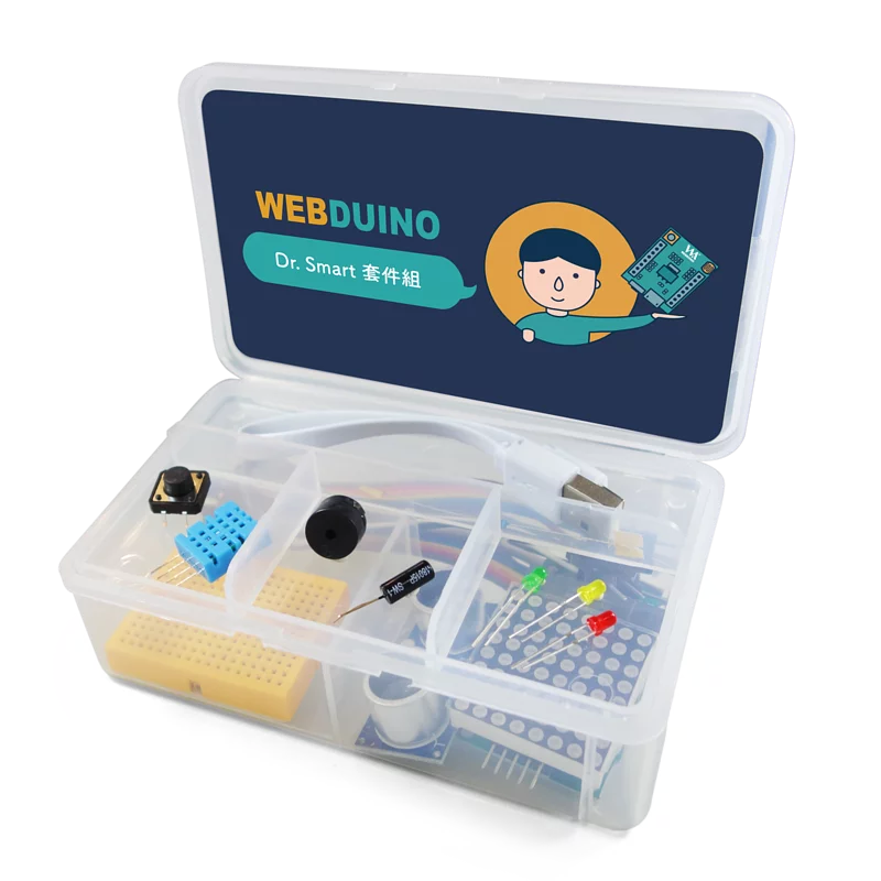 Dr. Smart 開發者套件內含 Webduino Smart 開發板與多個電子元件、傳感器,是 Webduino 系列產品中最精簡的一個組合。搭配官方網站一系列對應的教學案例,你將可以在最短的時間內,快速地學習到 Webduino 的基礎精髓!