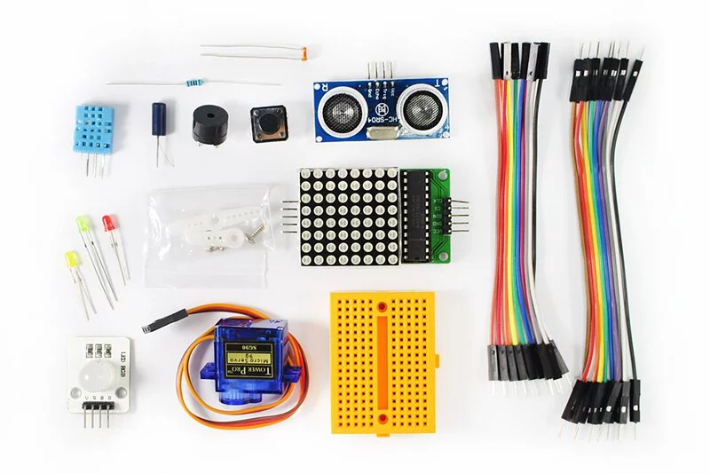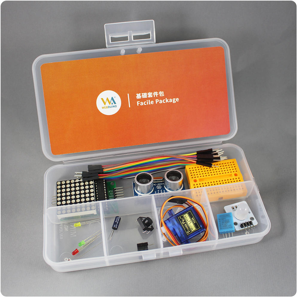 Webduino 基礎套件是入門的零件材料包,所對應的範例在官方網站均有提供,可從中學習到基本的電子電路,從點亮一顆 LED 燈開始,到自由操控七彩霓虹燈,從玩轉按鈕開關到用超音波傳感器控制 Youtube 影音播放、甚至可以偵測溫濕度來開啟風扇等,以上都只是一小部分的創意應用,更多想像的空間就留待你的創造力去實現。