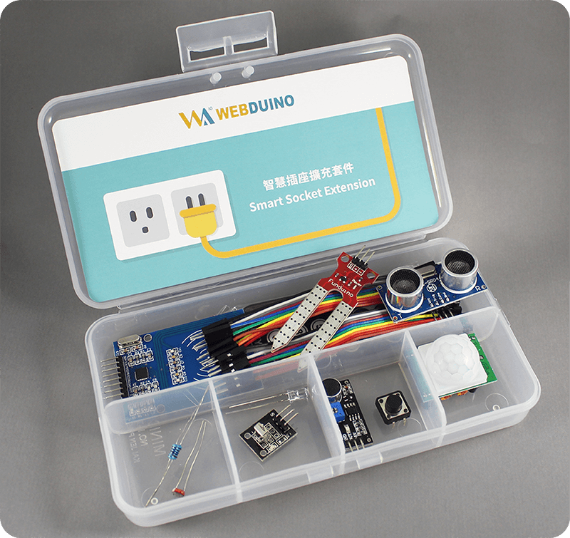 本套件為實現 Webduino 智慧插座各種創意實作的擴充套件組,搭配著「Webduino 智慧插座」一同實作,亦可跟隨著「實戰家電物聯網」書中的教學步驟,一步步帶您從行動裝置控制到串接網頁資料庫等多項有趣的互動方式。擁有它,您就可以輕輕鬆鬆學習智慧插座的實作技巧哦!